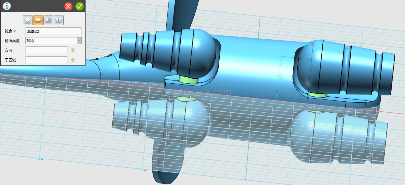 轮廓选择绘制的草图,对称拉伸10,如图:
