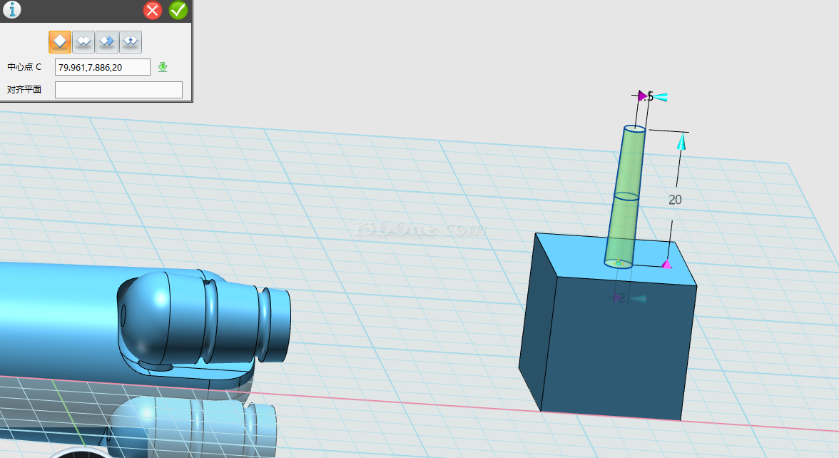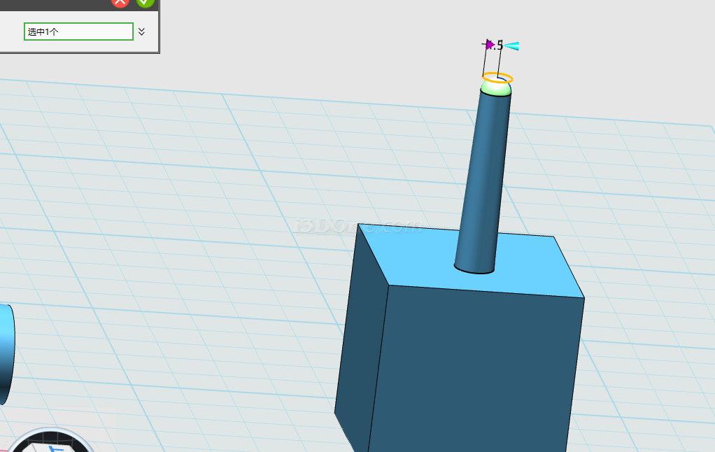 如图,选择圆锥体命令,在六面体上方绘制一个圆台,顶部半径为1.5,高位20,底部半径为2,完成圆台建立。