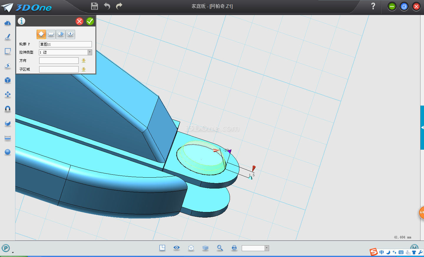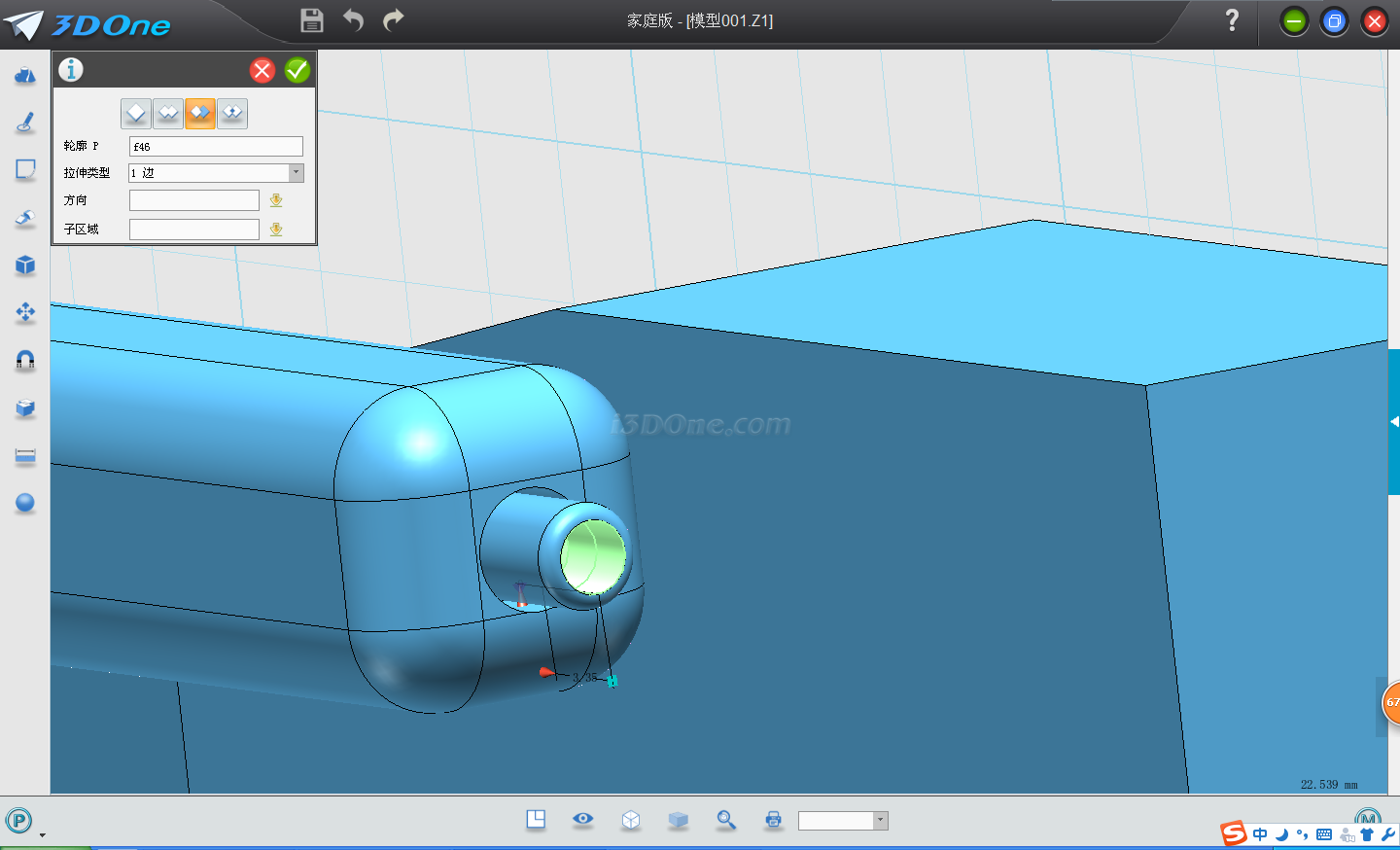 7.再点击拉伸,选择绘制圆柱的上表面,输入距离3.35,点击减运算。