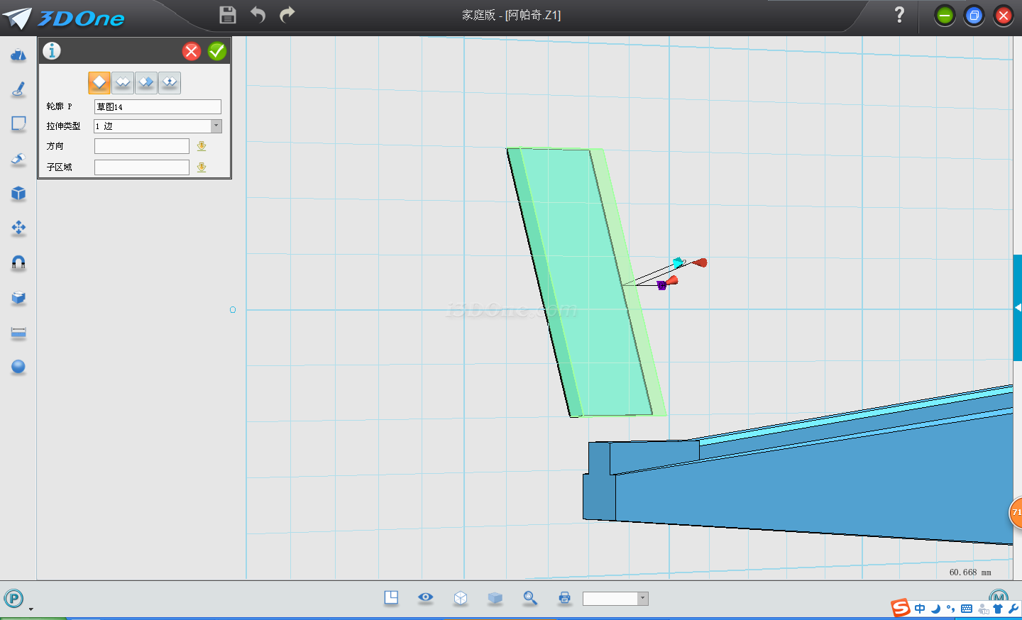 2.点击拉伸,选择左边长方形,输入拉伸距离80,再选择锥销命令,基准面选择最左边面,确定可得: