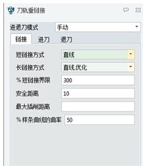 点击下面的“进退刀和链接”按钮,那么就会跳出进退刀的设置窗口,在这里我们可以设置进退刀圆弧方式,以及链接方式。