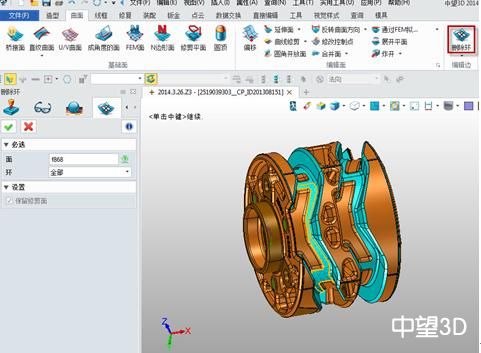 首先,创建一个面,用来生成刀轨。使用xelega3D“曲面”里面的“删除环”功能,选中底部的蓝色面。整个操作方式十分直观。