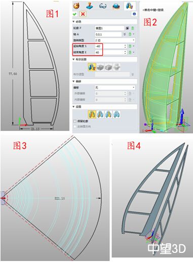 1.首先在XZ面绘制草图1,如图1;将草图1向两侧各旋转40度,如图2;在XY面插入草图2,绘制如图3所示的图形,用拉伸——减运算拉伸草图2,效果如图4。