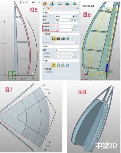 2.接着在XZ面绘制草图3,如图5;将草图3向两侧各旋转35度,如图6;在XY面插入草图4,绘制如图7所示的图形,用拉伸——减运算拉伸草图4,效果如图8。