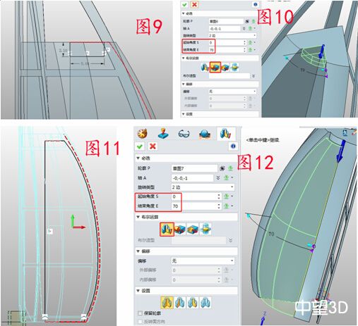 3.在模型内槽表面插入草图5,绘制如图9所示的图形;将草图5旋转70度,数据如图10;在相同的位置再次插入草图6,绘制图11所示的图形并旋转,数据如图12。