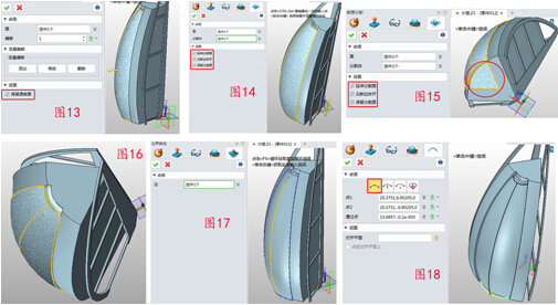 4.点击曲面——面偏移,把图13所示的面向外偏移一定距离;点击曲面——曲面分割,面选择偏移后的面,分割体选择XZ面,如图14;再次应用曲面分割,面选择偏移并分割后的两个面,分割体选择图15所圈定的面以及其对应的顶面(图16所示);点击线框——边界曲线,提取图17所示的黄色曲线,并将弧面隐藏;点击线框的弧线工具,如图18,用三点方式绘制弧线。在这点上我不得不赞叹xelega3D的曲面建模功能真的很快捷方便,大大提升设计师的效率。