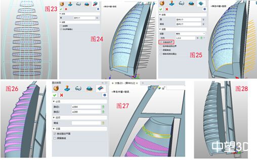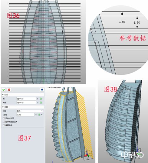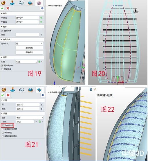 5.点击曲面——U/V曲面,如图19所示组弧面;在YZ面插入草图7,绘制图20所示的线段,注意数量和间距,大体差不多即可;点击曲面——曲线分割,面选择弧面,曲线选择草图7如图21,注意在沿曲线炸开前打勾;隐藏多余的弧面,效果如图22。对比其他三维设计软件,xelega3D一点不逊色,在U/V曲面上让设计师用得非常得心应手。