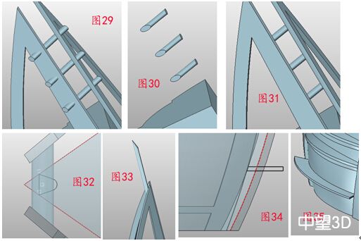 7.在XZ面插入草图并拉伸出三个圆柱,效果如图29,在XY面插入草图,然后用拉伸的减运算修建三个圆柱,效果如图30、31;同理依据图32的草图拉伸出柱体,并修剪,如图33;在XZ面插入草图9,绘制图34所示的图形,用旋转工具左右各旋转35度,效果图如图35。