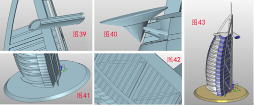 9.由于篇幅限制,图39——图42的几个细节部分就不详细介绍了,也是用常用的工具实现的,比较简单,可以当做练习自己做一下,不清楚的地方可以在论坛上交流。用视觉样式的面属性对模型各个部位上色,最终效果图如图43。