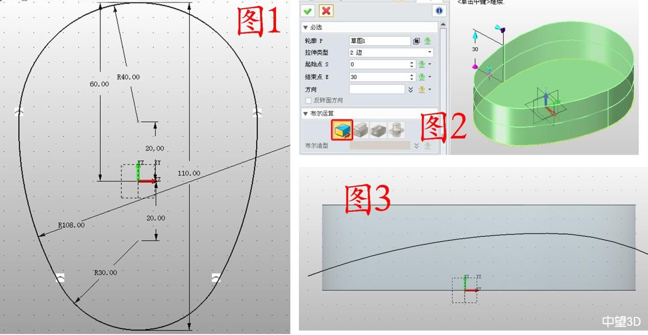 1. 在XY面快速插入草图1,绘制图1所示的图形,数据如图(4段弧线相切连接),绘制完成后点击“连接”,将其连成一个整体;点击造型——拉伸,拉伸草图1,数据如图;在YZ面插入草图 2,绘制图3所示曲线,大致相似即可。