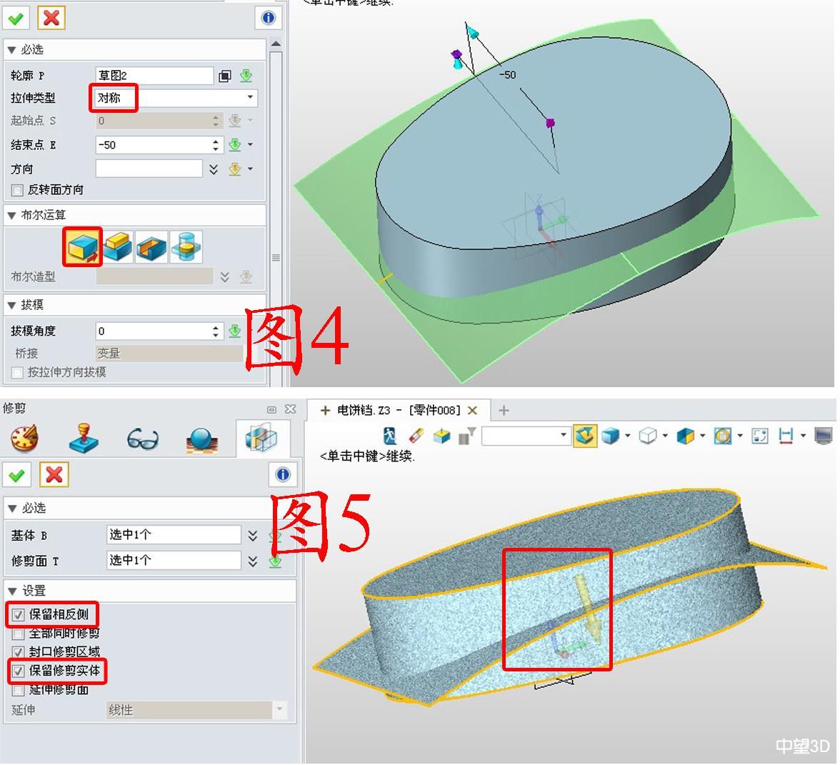2. 点击拉伸——基体,拉伸草图2,形成曲面,命名为曲面1,如图4;点击造型——修剪,“基体”为实体造型,“修剪面”为曲面1,如图5,注意红框中黄色箭头的方向为要保留的方向。另外,在保留修剪体的前面打钩,保留曲面1。