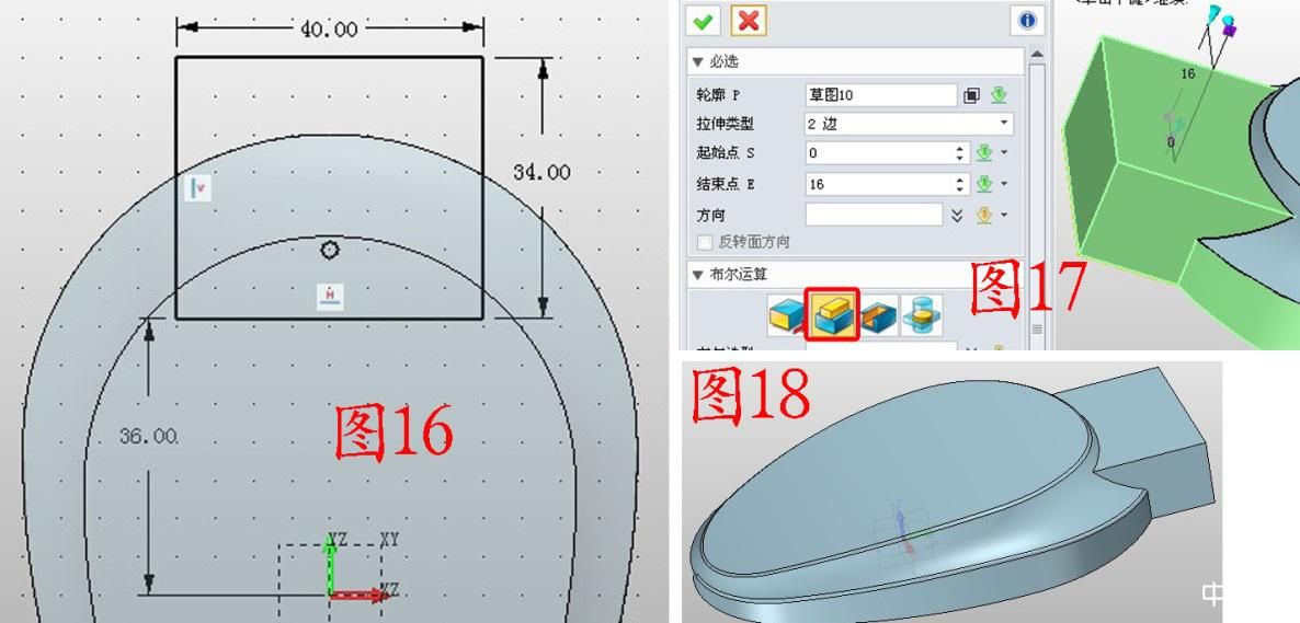6. 在XY面插如入草图4,绘制图16所示的矩形,参数如图;点击拉伸——加运算,拉伸草图4,数据如图17;将上盖边缘做圆角处理,如图18所示;