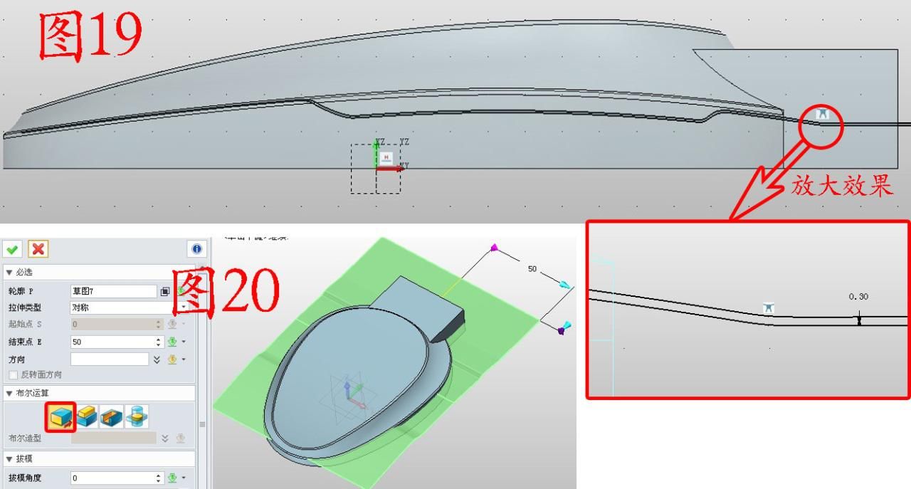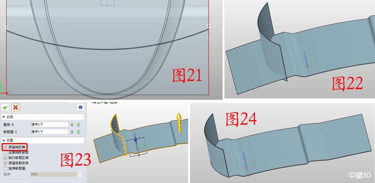 8. 在XY面插入草图5,同理绘制图21所示的闭合图形,退出草图后拉伸草图5,隐藏电饼铛造型,如图22;点击造型——修剪,“基体”为竖直实体,“修剪面”为水平实体的上表面,注意保留方向,如图23;同理,修剪成图24所示的造型。