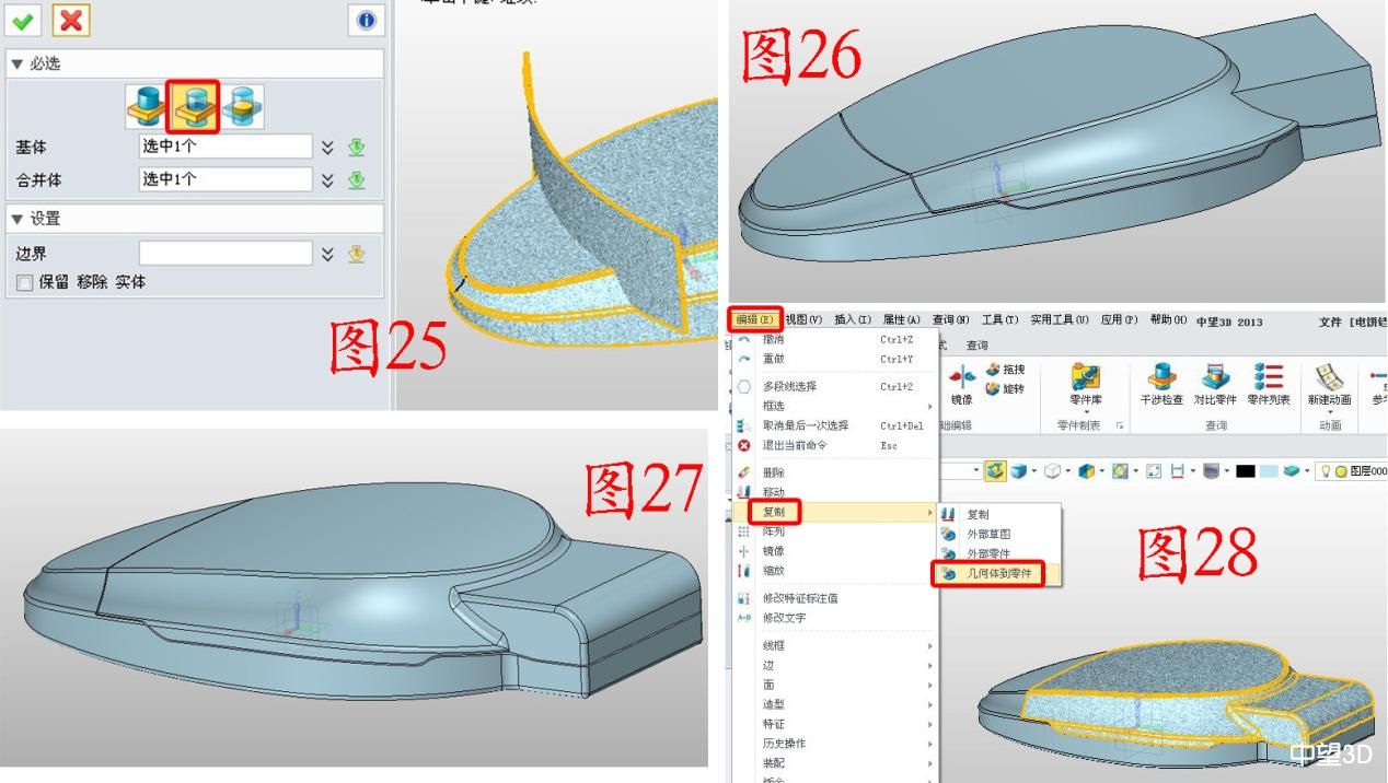 9. 显示出电饼铛造型,点击造型——组合——减运算,“基体”为电饼铛造型,“合并体”为竖直实体,如图25;同理再次组合水平实体,效果如图26;将造型边缘做圆角处理,如图27。