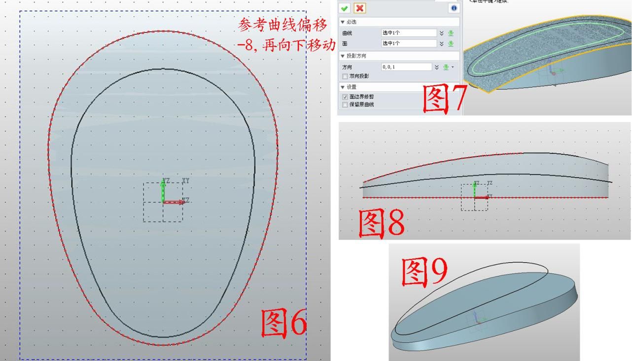 3. 在XY面插如草图3,绘制图6所示的闭合曲线(绘制技巧:将红色虚线所示的部分设置成参考曲线,点击偏移,将红色虚线偏移-8,偏移后即可得到黑色的实线,由于版本不同,有些偏移后可能还是红色虚线,此时在虚线上右击,点击即可转化成可编辑的实线,然后再将其向下移动一点距离);点击线框——投影到面,曲线选择草图3,面选择曲面1,如图7,投影后的曲线命名为曲线1,隐藏曲面1;在YZ面插入草图,绘制图8所示的曲线,然后按照步骤2的方法,先拉伸在修剪,效果如图9。