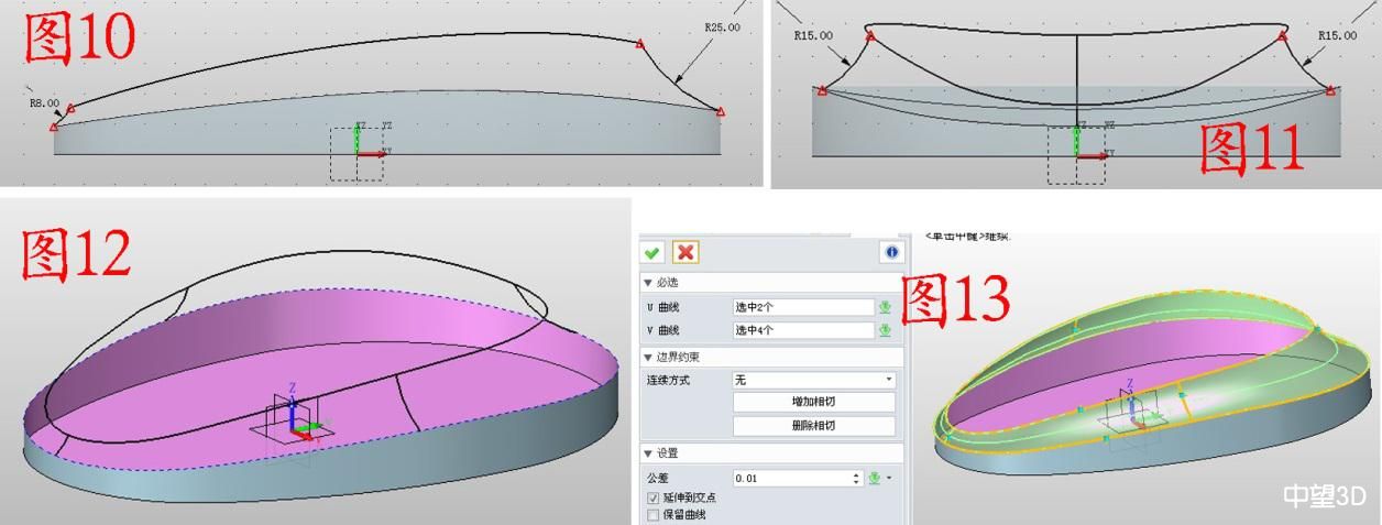 4. 在YZ面插入草图,点击参考曲线——相交曲线,按照图10设置出参考点,分别在两个参考点间绘制半径为8和25的弧线,分别命名为曲线2、曲线4;同理,在XZ面插入草图,绘制两个半径均为15的圆弧,分别命名为曲线3、曲线5,如图11;将实体造型的上表面删除,将开放边命名为边1,如图12;点击曲面——U/V曲面,“U曲线”为曲线1、边1,“V曲线”为曲线2、3、4、5,如图13。