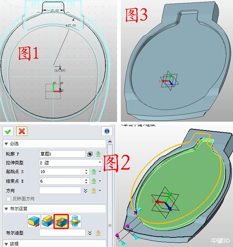 1. 同理进入“上盖”的编辑。在XY面快速插入草图1,绘制图1所示的图形,参数如图1;用减运算拉伸草图1,参数如图2;在边缘做圆角处理,如图3。