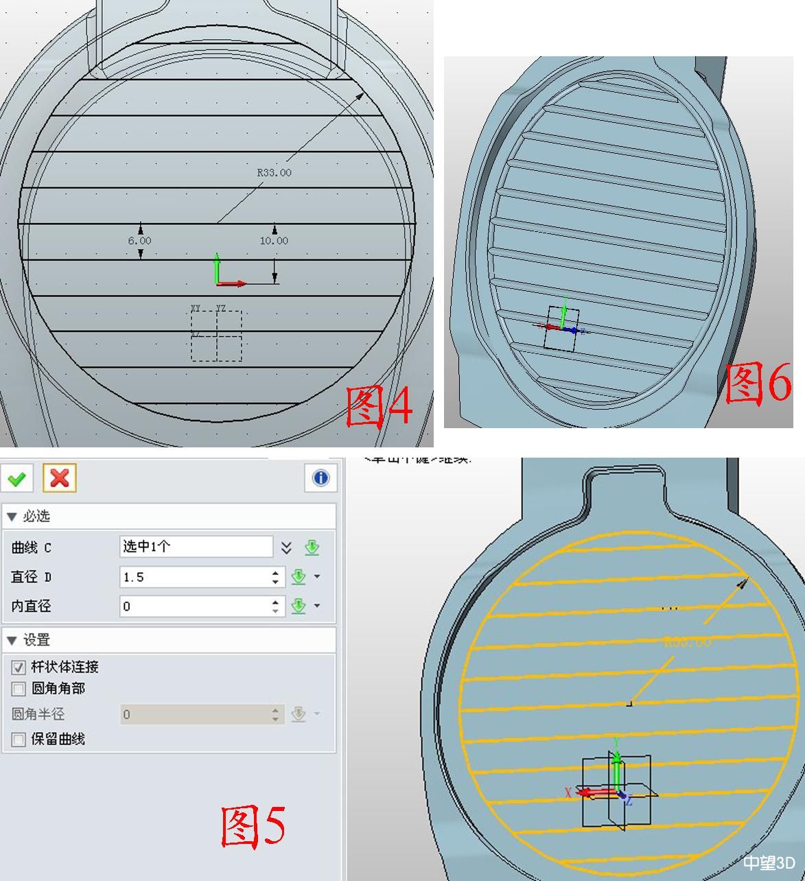 2. 在XY面插入草图2,绘制图4所示的图形,参数如图;点击杆状扫掠,将草图2扫掠成圆管,半径为1.5,如图5;点击组合——加运算,将两部分合并为一体,效果如图6。操作方便快捷,大大提高效率。