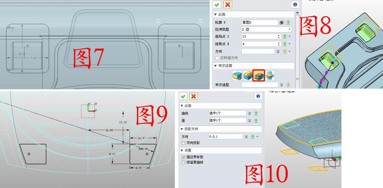 3. 在XY面插入草图3,绘制图7所示的图形,参数如图,两个图形是沿Y轴对称的,所以做完一边,用“镜像”工具复制一下即可;用减运算拉伸草图3,参数如图8;在XY面插入草图4,绘制图9所示的图形;点击线框——投影到面,“曲线”为草图4,“面”为图10所示的面,投影后的曲线命名为曲线1。
