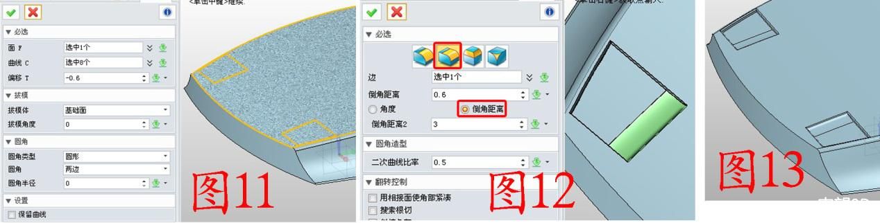 4. 点击造型——镶嵌,“面”为图11所示的面,“曲线”为曲线1,其他参数如图11;点击造型——圆角——椭圆圆角,将如12所示的边做圆角处理,参数如图;同理将另一侧也做椭圆圆角,效果如图13。