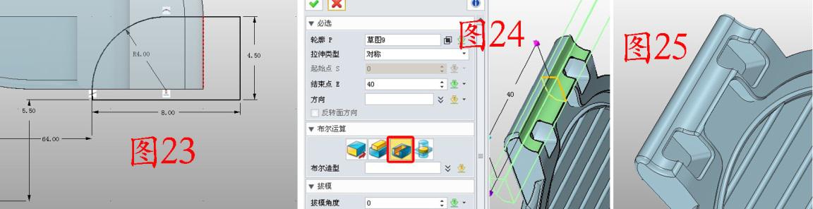 7. 在YZ面插入草图7,参数如图23;用减运算拉伸草图7,如图24;对拉伸后的边缘做圆角处理,效果如图25。