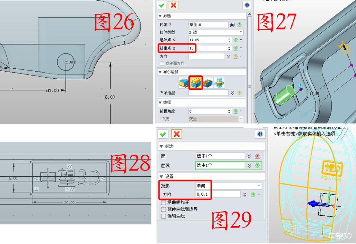8. 在YZ面插入草图8,在图26所示的位置绘制圆;用加运算拉伸草图8,“起始点”数据用捕捉的方式获得,靠在内壁即可,“结束点”为13(和《绘制底座》中步骤5的“结束点”13相一致,这样做装配步骤的时候,两个部件能紧密接触,不至于错位),参数如图27,注意在“保留轮廓”前打钩,可以在拉伸另一侧的时候继续使用草图8;在XY面插入草图9绘制如图28所示的LOGO(当然可以用你喜欢的图案),需要注意的是问题需要炸开;点击曲面——曲线分割,“面”为盖子顶部的面“曲线”为草图9,注意投影方向,如图29。点击视觉样式——面属性,给“盖子”部分上色,同理,给“底座”部分上色。