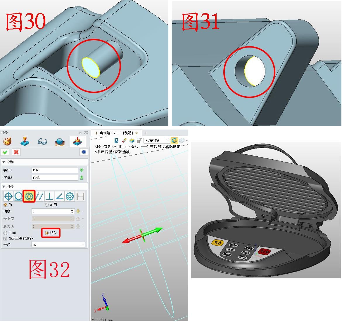 退出“底座”的编辑,点击装配——对齐,选择“同心”选项,将图30、图31中红色圆圈的高亮部分分别选定,注意方向,如图32,用相同的步骤,将两部分用“相切”选项对齐。现在大功告成了,用拖拽工具打开盖子看看吧。