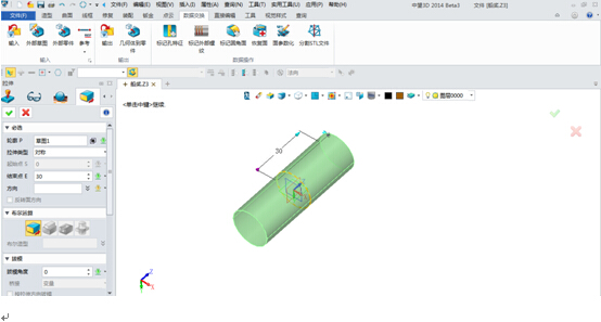 第一步,手柄绘制。选择XY平面插入草图,绘制一个直径为20mm的圆,点击退出,选择拉伸选项,拉伸类型选择对称,结束点为30,点击确定完成手柄的绘制,如下图所示:
