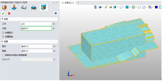 9.最后一步拆模,分开上下模仁,“工件”选择上一步创建的“工件”,“分型”选择创建的“分型面”,确认。