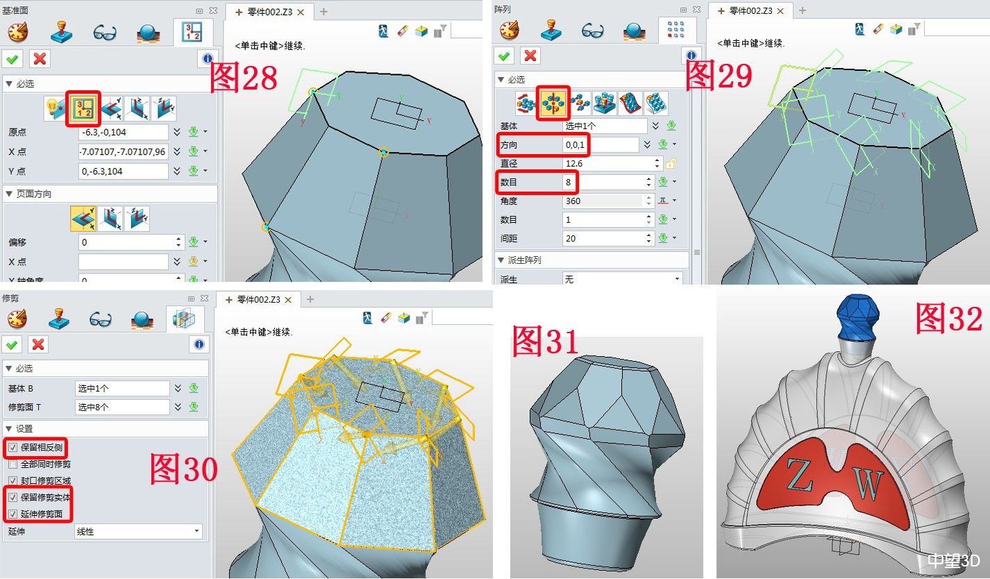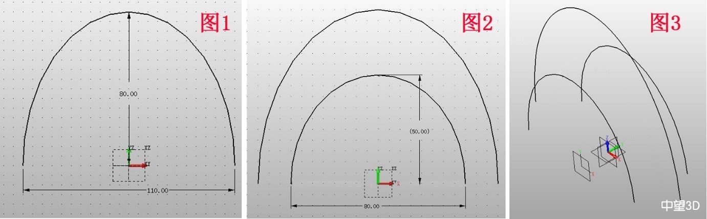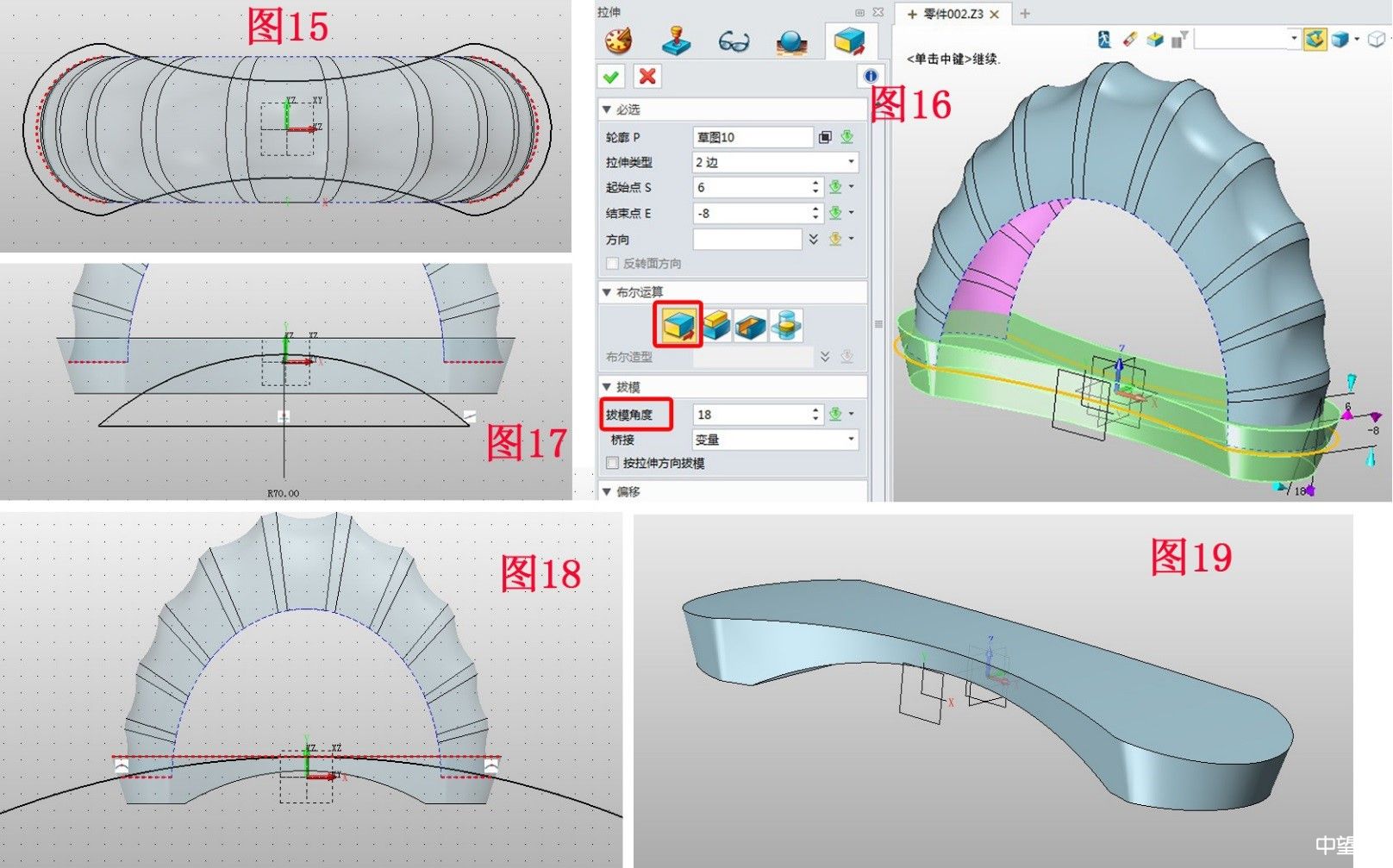 4、在XZ面插入草图5,按图11所示绘制11个弧线;在基准面1上插入草图6绘制半圆弧,即步骤1图2中的半圆弧,注意按图12所示修剪到多余的部分;退出草图后将草图6镜像到另一侧,如图13所示;点击U/V曲线,按照图14所示修补曲面,同理修补剩余的所有曲面。