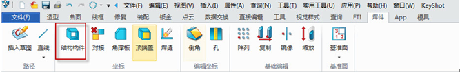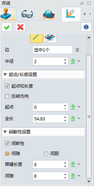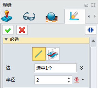 焊缝功能是为是在几个构造之间创建焊缝造型。点击焊缝功能,我们可以选择焊接边,也可以通过相交间接的创建焊接边,也可以选择焊缝的半径。