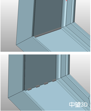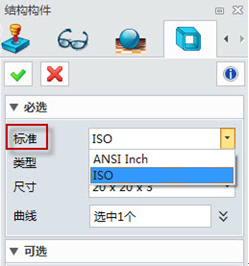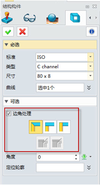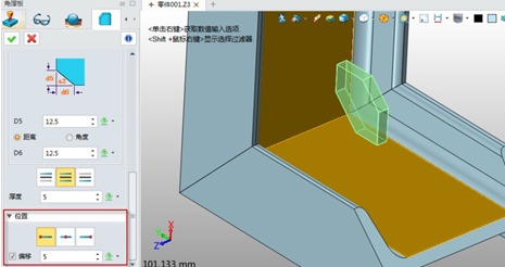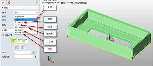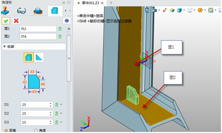 下面我们介绍如何创建角撑板,首先点击“角撑板”命令,选择需要创建的面1以及面2,可以选择轮廓类型,以及设置需要的尺寸大小。