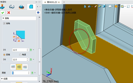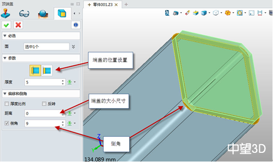 顶端盖功能是在封闭的区域断面生成一个盖子,并且这个盖的大小尺寸,以及厚度都可以随时修改,并且我们可以调接倒角大小。